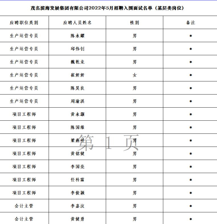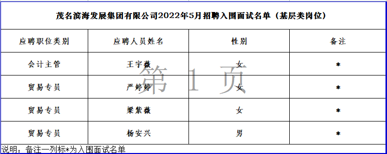 根據(jù)《茂名濱海發(fā)展集團(tuán)有限公司2022年5月入圍面試名單》精神,現(xiàn)將入圍面試的名單進(jìn)行公示。