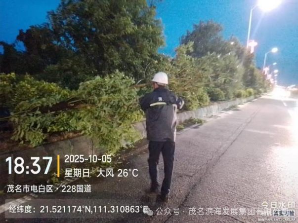 與此同時,養護中心搶險隊優化力量配置,采取“兵分兩路”工作模式,對茂名港大道、S291省道、轄區國道及X848縣道等展開全域巡查,及時發現并疏通積水點,協同清理國道沿線倒伏樹木,快速消除多處道路安全隱患,保障了道路基礎通行條件。